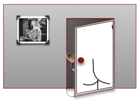 The picture is made of several shapes with colour fill, gradient fill and masked images. On the wall: a famous portrait of Picasso with bread buns as his fingers and on the door is a copy of his drawing Femme.
